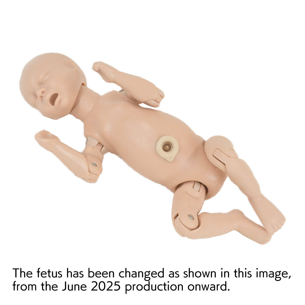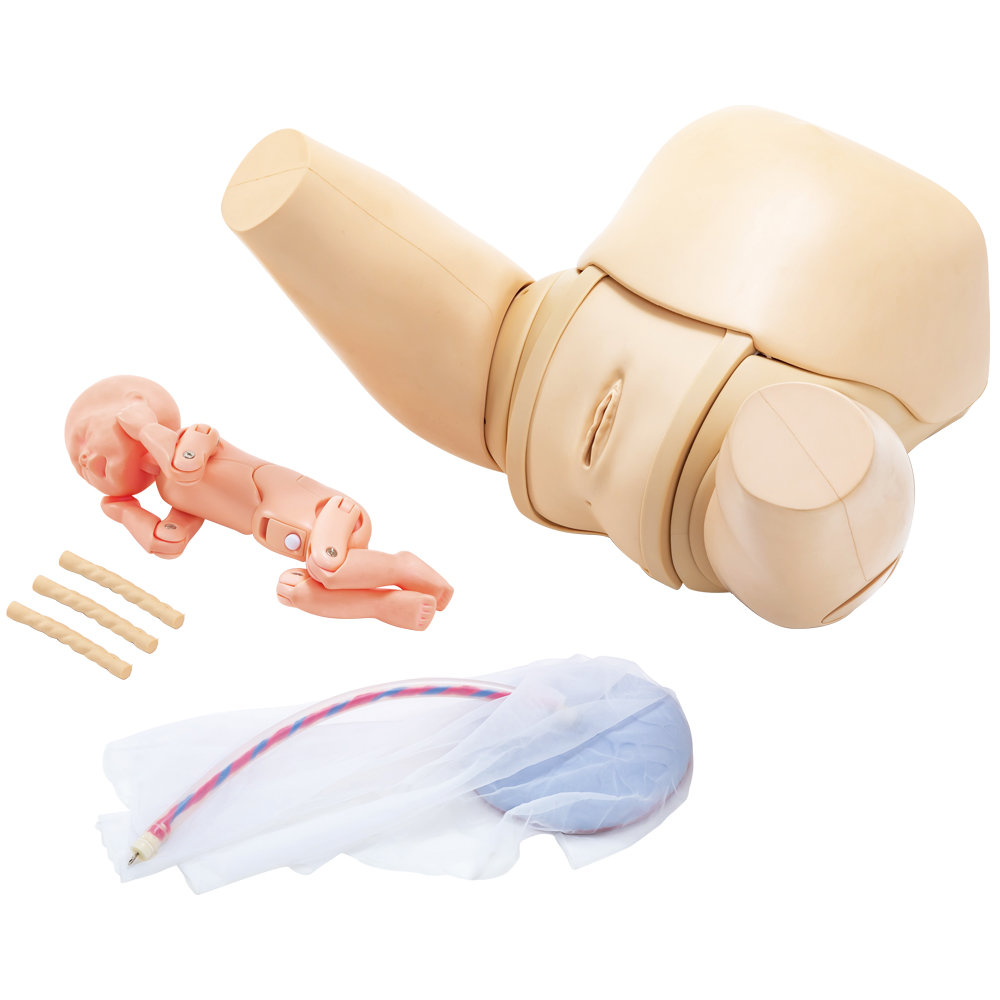 - Genitales externos elásticos, forma realista del canal vaginal y el asa de sujeción para el cuerpo materno facilitan la simulación de un parto sin problemas.